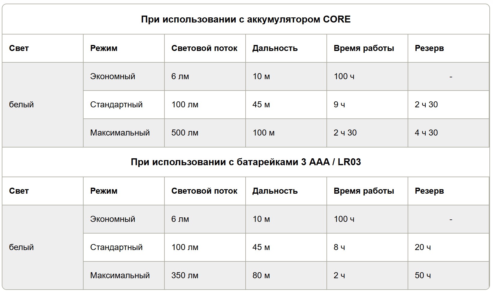 - HYBRID CONCEPT: фонарь также можно использовать с обычными батарейками ААА, однако при этом показатель максимального светового потока изменяется на значение 350 люмен